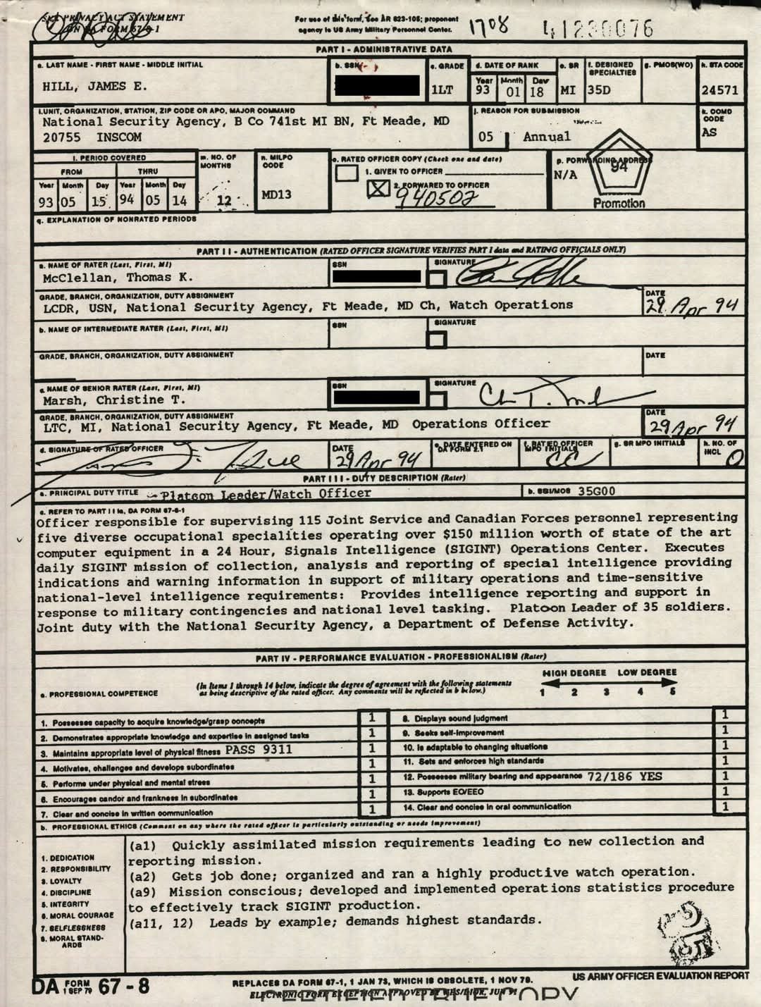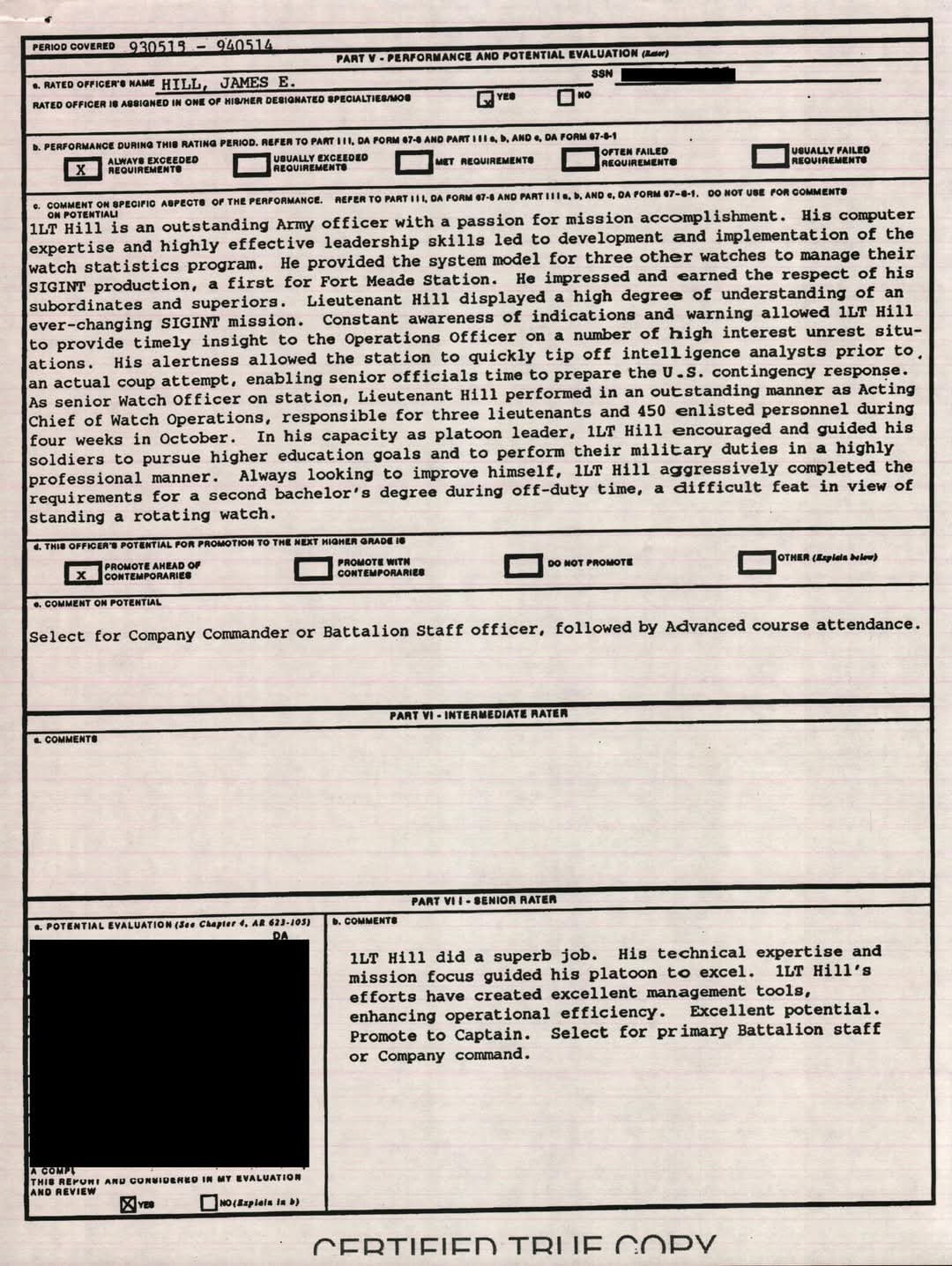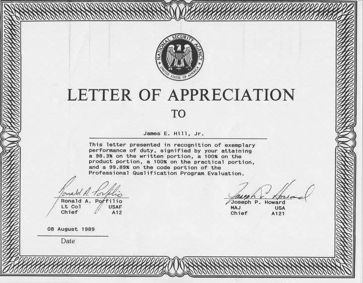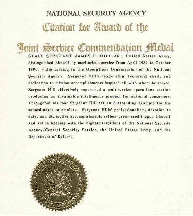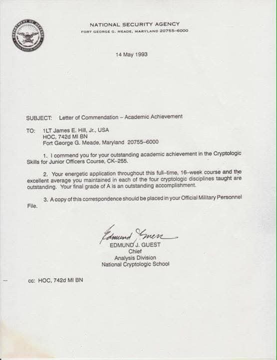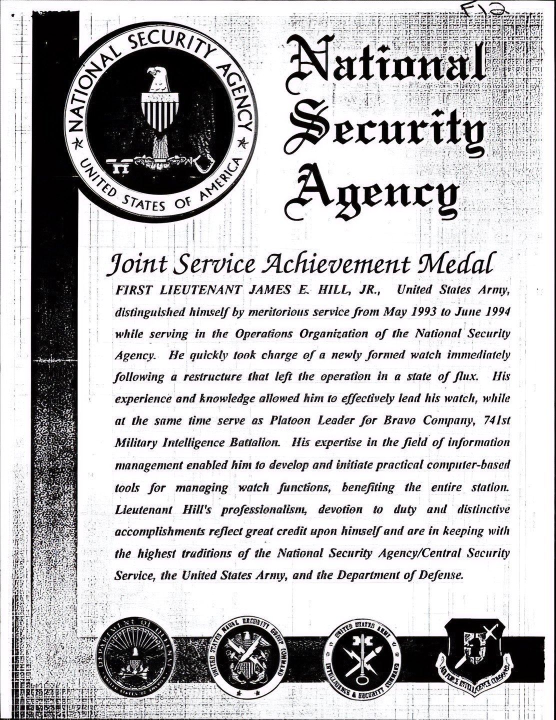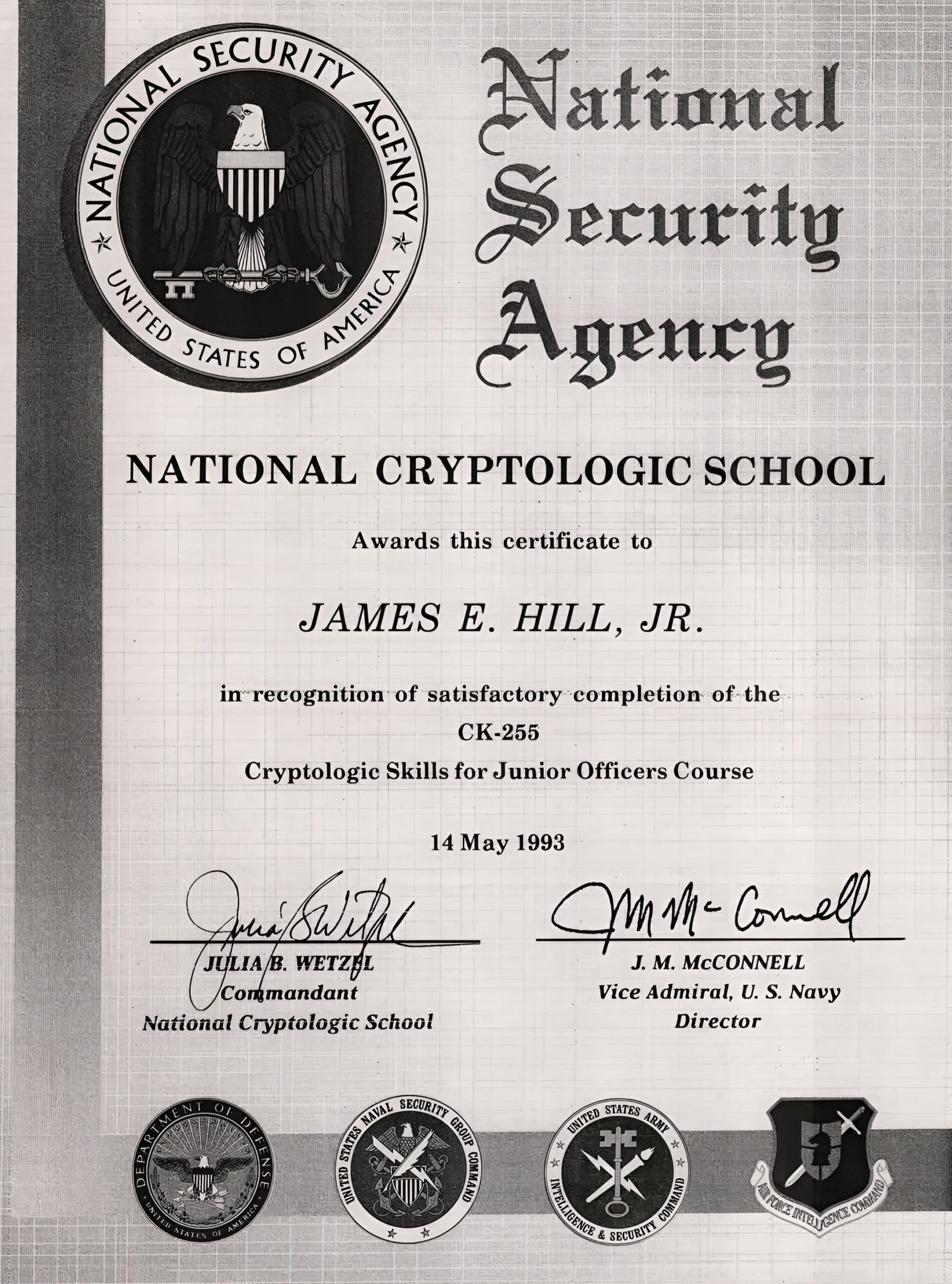 He is a graduate of the United States Army Intelligence School Devens (USAISD) Electronic Warfare SIGINT Morse Interceptor Course (231-05H10), the VII Corps NCO Academy Augsburg Germany Primary Leadership Development Course (PLDC-Class 8-87), the USAISD Electronic Warfare SIGINT Morse Interceptor Basic Non-commissioned Officer Course (231-05H30), the U.S. Army’s Basic Airborne course, the 1st Special Forces Scuba Divers course, U.S. Army’s Military Intelligence Officer Basic Course, the US Army Ranger Indoctrination Program, the Military Intelligence Officer Advance Course, the Defense Intelligence College Mobile Sensitive Compartmented Information Course, the Joint Military Intelligence Training Centers’ Intelligence Collection Managers Course, the U.S. Army Transportaction School Air Deployment Planning Course (ADPC), the Armed Forces Staff College Joint Planning Orientation Course (JPOC), and the 3/311 Infantry 78th Training Division Observer Controller Course. In addition, Dr. Hill is a graduate of the National Security Agency’s National Cryptologic University’s AROF Morse Collection Supervisor course (EC023), OPSEC Fundamentals for NSA-CSS Managers (OP200), National Information Security Course (CS-300), the Transmission Security Course (CS-141), and the Cryptologic Skills for Junior Officer’s Course (CK-255), maintaining a 4.0 grade point average. The Cryptologic Skills for Junior Officer’s Course provides equivalent credit for the National Cryptologic University’s Introductory Writing Course (EG-022), Introduction to Cryptography and Exploitation of Manual Cryptosystems Course (CA-105), Writing Techniques (EC-202), Introduction to ELINT Analysis for Fusion Reporters (IS-070), Introduction to SIGINT Reporting (IS-180), SIGINT Reporting (IS-280), Basic Traffic Analysis (TA-103), Technical Reporting for Non-Traffic Analysts (TA-160), and Principles of Collection Management (TM-201).