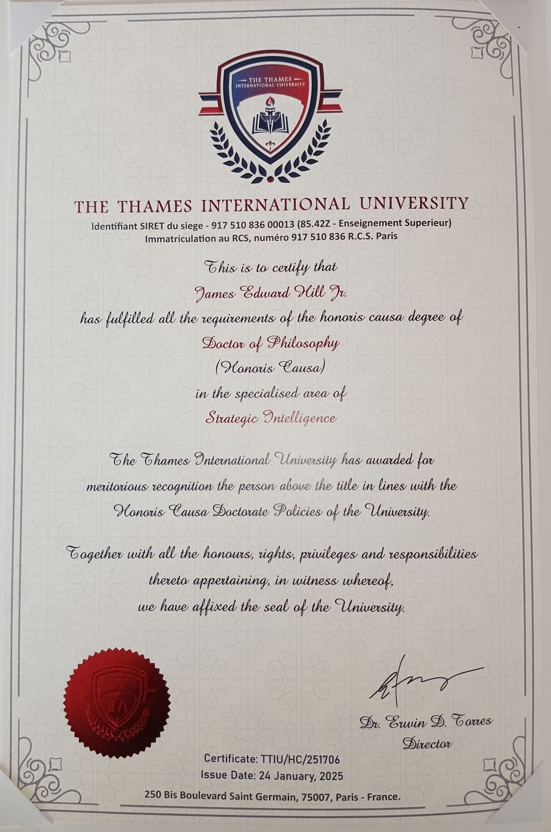 Dr. James Edward Hill Jr., PhD/DSc/MSc/BSc, also known as Jim Hill, is a distinguished military signals intelligence officer with an extensive career in tactical, technical, signals, and strategic intelligence. He holds four PhDs, one Master’s, and two Bachelor’s degrees. In addition, Dr. Hill has performed twice as a National Security Agency (NSA) Watch Operations Commander within the NSA’s high op-tempo Indications and Warning Watch Operations Center and possesses multiple National Security Agency professionalizations.
